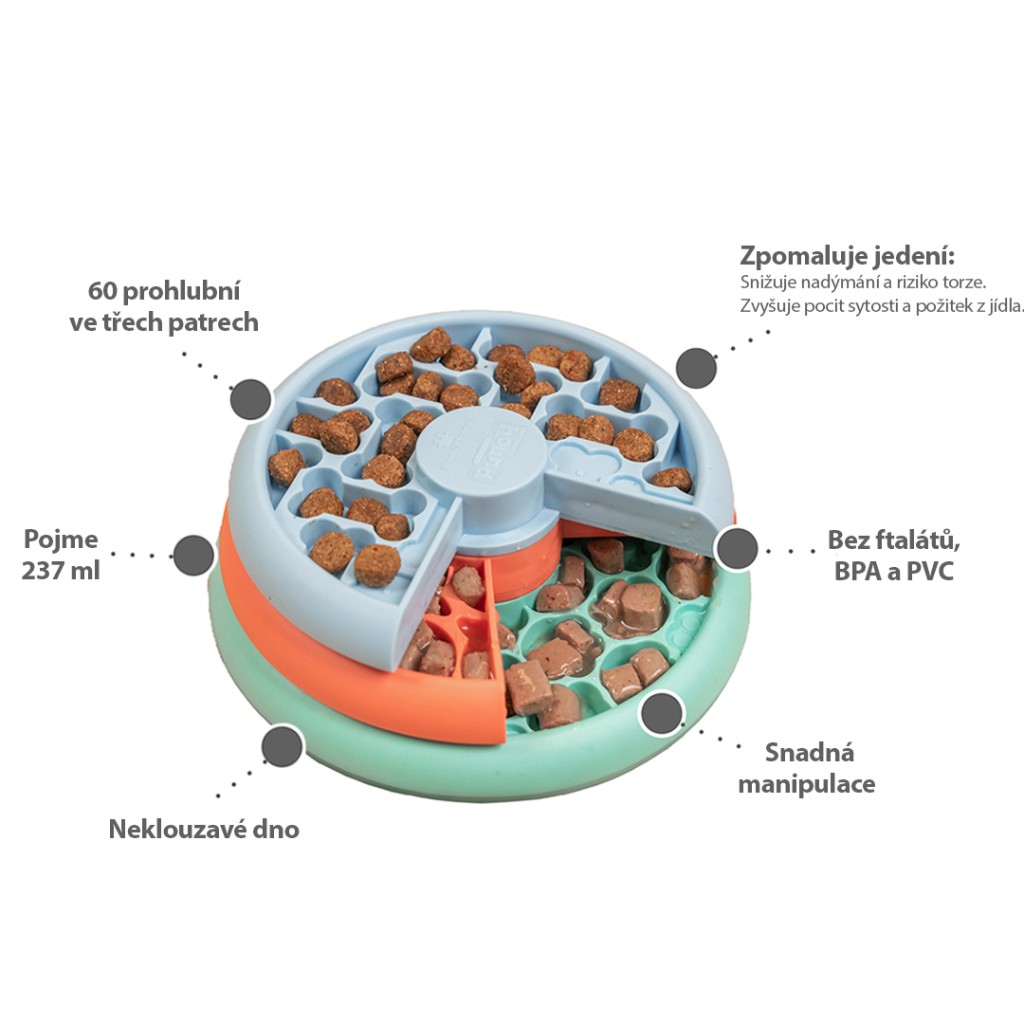 Lízací i schovávací zábava pro štěňata a malé psy. Tři otočná patra s více jak 60 prohlubněmi různých tvarů. Skvělé pro rozvoj jemné motoriky, zpomalení jedení a zabavení všech malých psích hlaviček. Olizování pomáhá psům se uklidnit, pomalé jedení zlepšuje kvalitu trávení. Skvělá hra pro hltače a zaručený zabiják nudy.