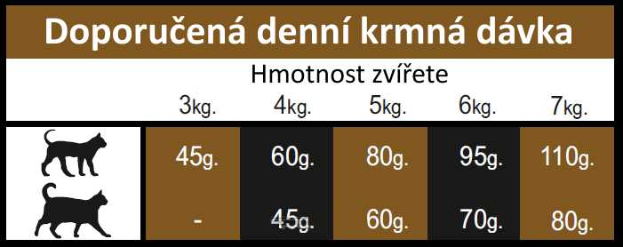 ANALYTICKÉ SLOŽKY: Hrubý protein 31%, hrubý olej a tuky 17%, mastné kyseliny omega 6: 3,3%, mastné kyseliny omega 3: 0,35%, hrubá vláknina 3,5%, celková dietní vláknina 6,5%, hrubý popel 7,5%, vápník 1,3%, fosfor 1,15%,